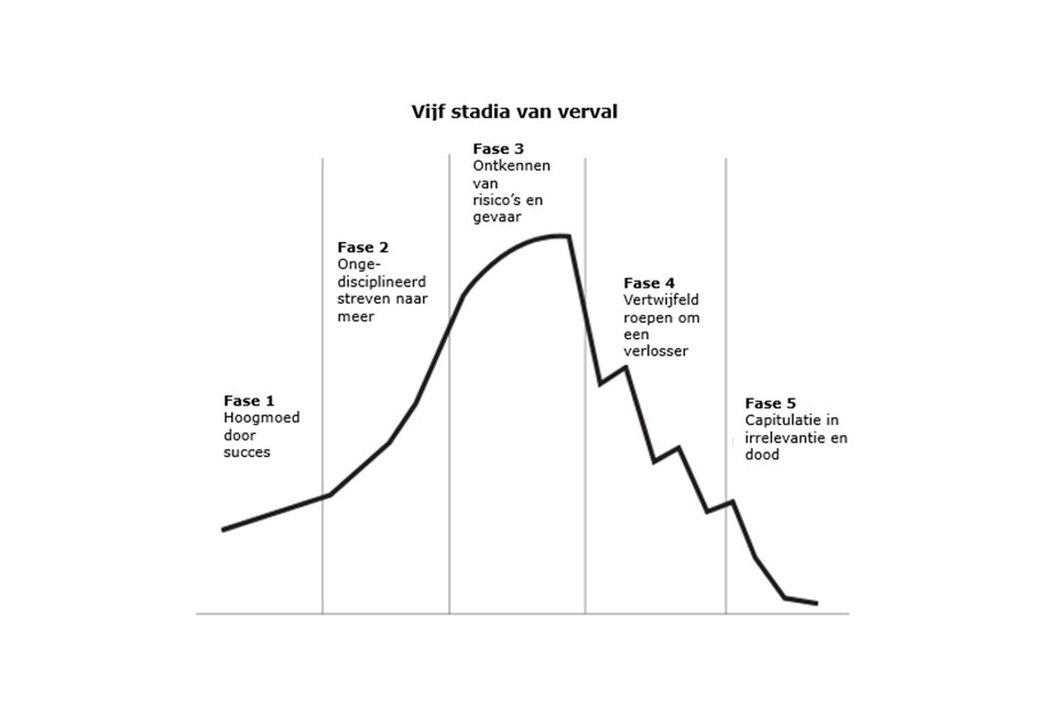Ze publiceerden hun bevindingen in een van hun belangrijkste boekjes: ‘How the mighty fall and some companies never give in’. Bij het bestuderen van bedrijven die in verval raakten en tot onbeduidendheid vervielen, ontdekten zij dat er een patroon was dat zij allemaal volgden. En interessant genoeg laat het ons zien hoe macht kan corrumperen door overmoed, egocentrisme, luiheid en lafheid.